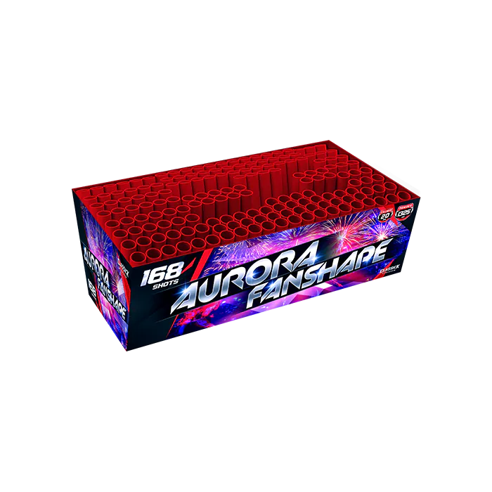 PYROSHOW AURORA FANSHAPE 160 SHOTS n168 shots compound box met verschillende schietrichtingen: fanshape, W-shape én V-shape. Deze compound box heeft alles in huis voor een gegarandeerde vuurwerkshow. n