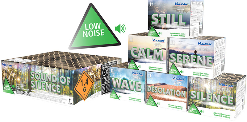 een verbluffende collectie van zes stille vuurwerken, ontworpen voor serene maar betoverende vieringen. Geniet van de visuele schoonheid van betoverende kleuren en betoverende patronen, terwijl u de rust van uw omgeving behoudt.