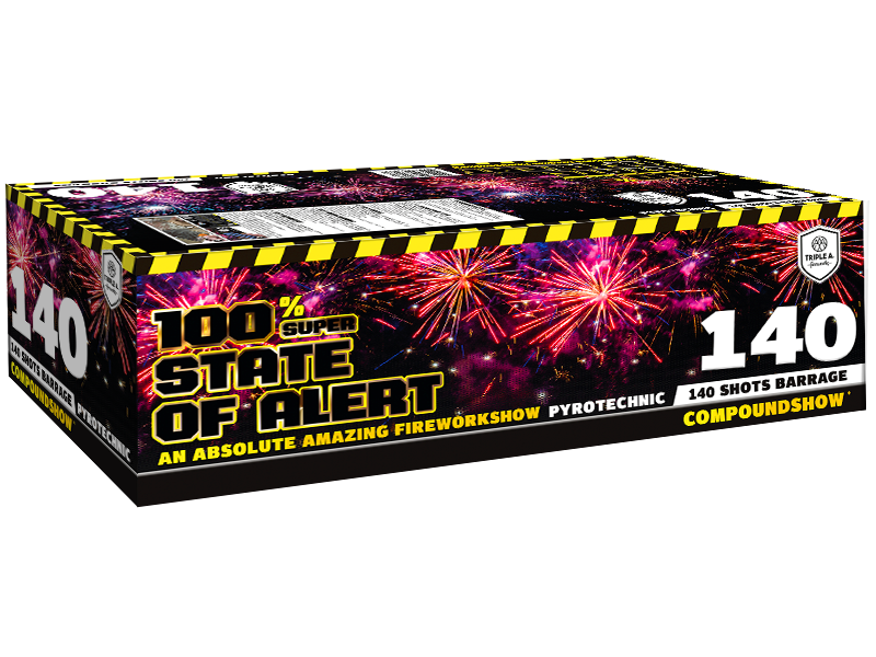 State of Alert nEen vuurwerk compound met een super prijs kwaliteit! 140 prachtige boeketten brengen jou in een staat van paraatheid! n nKruitgewicht 1000 Gram nTube diameter 20 / 25 nBrandtijd 50 Seconden nHoogte 25 m. – 30 m. n